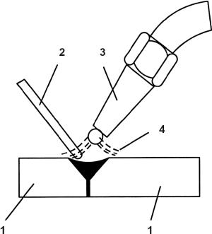 Сущность процесса газовой сварки (см. схему газовой сварки, рис. 2) заключается в том, что свариваемый и присадочный металлы расплавляются за счет тепла пламени (4) горелки. При этом кромки свариваемых заготовок (1) расплавляются, а зазор между ними заполняется присадочным металлом (2), который вводят в пламя горелки (3) извне. В качестве горючих газов применяются природные газы, нефтяные газы, а также водород, ацетилен, пары керосина и бензина и др. Наибольшее распространение получили сварка с использованием ацетилена, паров бензина, паров керосина, пропанобутана.