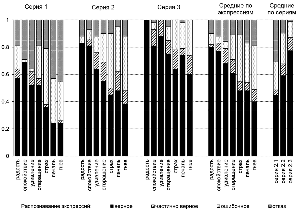 Точность распознавания экспрессий оценивалась на основании содержания дескрипторов, указывающих на модальность эмоции. Верными считались те описания, в которых эмоция была названа однозначно и совпадала с состоянием, которое изображал натурщик. К этой же категории относились и синонимичные описания; так, для экспрессии гнева адекватными считались описания «гнев», «злость» и однокоренные слова; для «страха» – «страх» и «испуг»; для «радости» – «радость» и «улыбка»; для нейтрального лица – «нейтральное», «спокойное», «без эмоции»; для «печали» – «печаль», «грусть» и «горе»; для «удивления» и «отвращения» синонимы в категорию верных ответов не включались. Частично верными ответами считались неоднозначные описания, включавшие верный дескриптор, например: «либо гнев, либо горе» для экспрессии «гнева». «Ошибочными» ответами считались все иные описания эмоциональных состояний, а «отказами» – ответы, в которых называние эмоции отсутствовало.