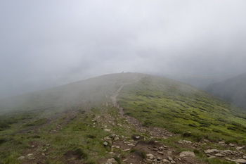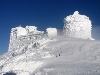 Горы – это не игрушка в любое время года, а зимой в особенности. Чем выше мы поднимались к вершине, тем больше вокруг сгущался туман, и уже через пару часов окутал нас плотной серо-белой пеленой. На расстоянии двух-трех метров не было видно абсолютно ничего и складывалось впечатление, что мы бредем в каком-нибудь бесконечном потоке густого молока. У проводника был навигатор, по которому команда и продвигалась вперед. Если бы я шел первым, то из-за полного отсутствия видимости, наверное, разбил бы себе лоб об обсерваторию, стоящую на вершине Поп-Ивана – мы попросту уперлись в одну из стен обсерватории, которая громадным белым слоном, покрытым со всех сторон толстым слоем снега и льда, возвышалась над горой.