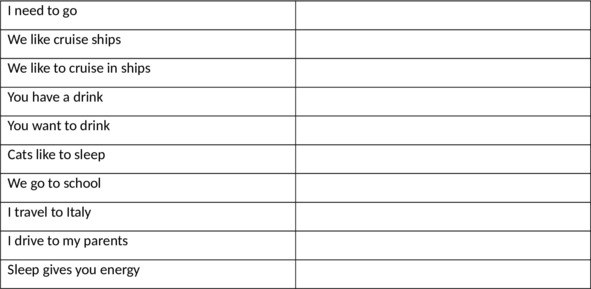 1. Переведите следующие фразы на английский, обязательно включите действие в ваше предложение, если его нет – придумайте. НЕ ИСПОЛЬЗУЙТЕ ГЛАГОЛ TO BE, ПЕРЕФРАЗИРУЙТЕ ПРЕДОЖЕНИЯ ТАК, ЧТОБЫ В НИХ БЫЛО ДЕЙСТВИЕ.