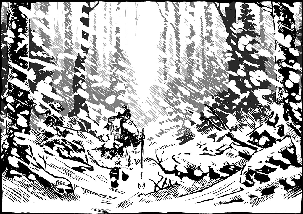 Метель утихомирилась; Петруха поспешил нацепить на плечи ящик с инструментами и зашагал через лес к восходящему солнцу.