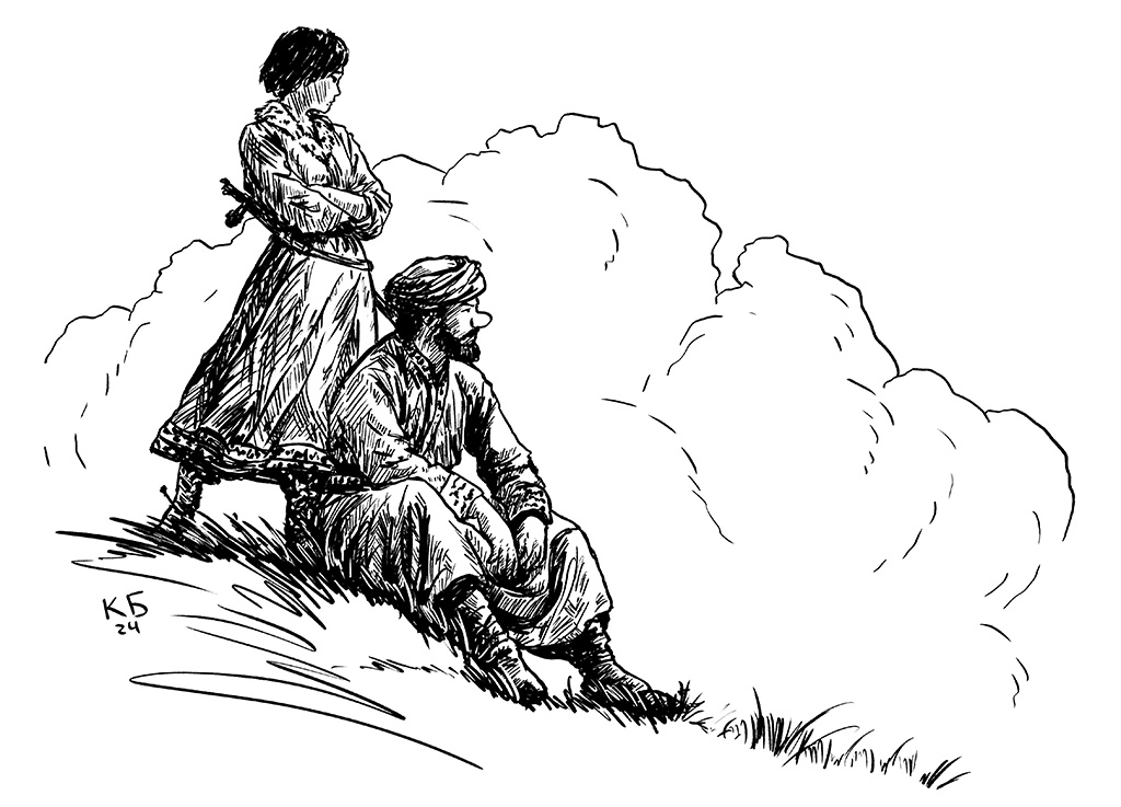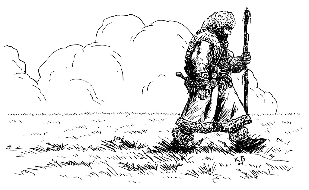 Скорым шагом шел взволнованный Устыыр сквозь бесконечную степь, где ни краев, ни времени, ни истории, ни мира – лишь море пахучей травы, цветов и вечное небо. Устыыр шел за колеей, прорезанной в земле колесами неизвестной повозки, поглядывал мельком на следы ног человеческих и не человеческих. Он так спешил, что отцепил от пояса разбитый бубен, чтобы не стучал по бедрам. Степь звенела болтающимися на шубе медными и серебряными привесками – и молчала…