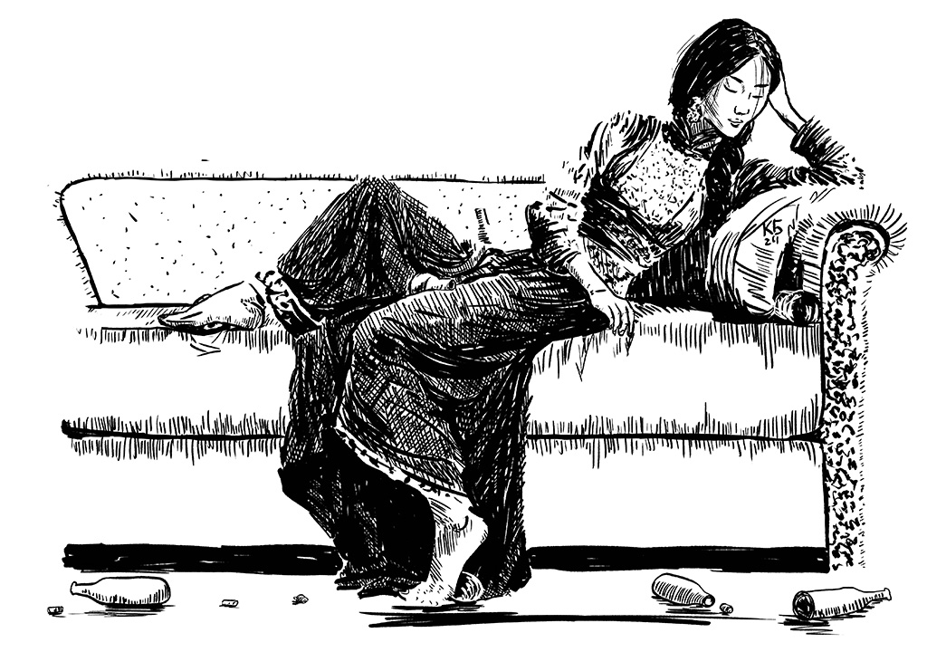 Сардан и Ашаяти вошли в ворота замка Эрээсина и долго блуждали потемками кривых коридоров, прежде чем наткнулись на дверь с изображением лиры. Дверь эта вела в более-менее крупную комнату, освещенную свечами и без окон. По центру стояла кушетка, а на кушетке, пытаясь придать себе некоторую элегантность, лежала женщина. Она была ооюткой, поэтому сходу определить ее возраст Сардану не удалось – в промежутке между пятнадцатью и до конца шестого десятка эти люди как будто бы вообще не менялись. На ней было узорчатое платье, какие не часто встретишь на севере, а на чайном столике рядом свернута была роскошная доха из шкур красных лисиц. На полу и кушетке валялось не меньше дюжины опустошенных флаконов анцинского ликера, еще два дразняще зажаты были между женских ног. Дама была безжалостно пьяна и кое-как поддерживала улыбающуюся голову дрожащей рукой.