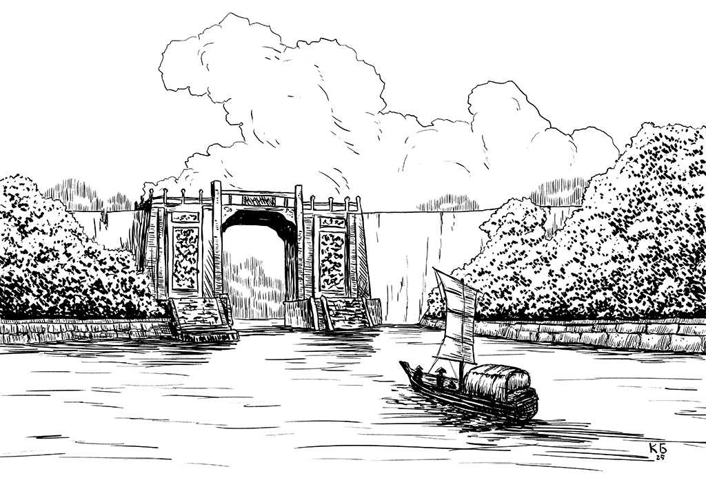 Вскоре по берегам реки встали высоченные ворота, раньше полностью перекрывавшие течение, а сейчас раскрытые настежь, облупившиеся.