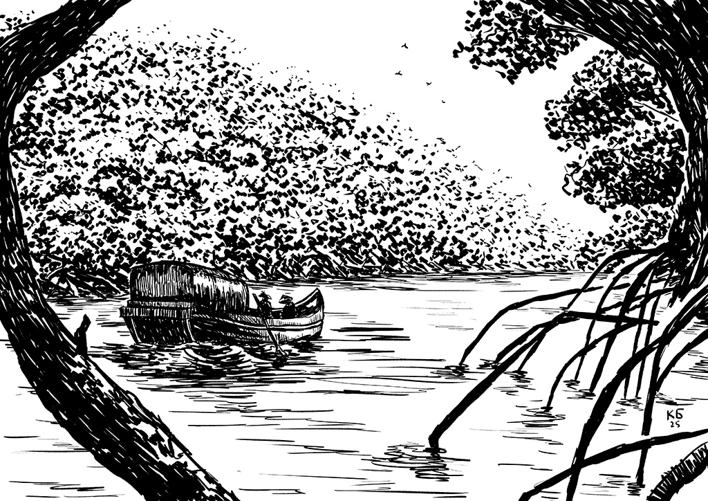 Толстые и кривые корни мангровых деревьев торчали из воды как храмовые колонны, вместе с шапкой шумящей листвы нависали над лодкой непроницаемым для солнца зонтом. Матросы убрали мачту и аккуратно гребли веслами. В сыром полумраке под корнями назойливо и ехидно жужжали комары, по ветвям ползали насекомые и ящерицы, а внизу воняло болотом. На ночь лодку привязали к толстому корню прямо посреди реки. Матросы и капитан как будто опасались приставать к берегу и поглядывали на лес с тревогой и как бы украдкой, – чтобы об их беспокойстве не узнали пассажиры. В темноте на палубе поставили простую жаровню, огонь которой бросал бледные отсветы на посеревшую листву. Лес хищно шумел, скрежетал, щелкал, квакал, рычал.