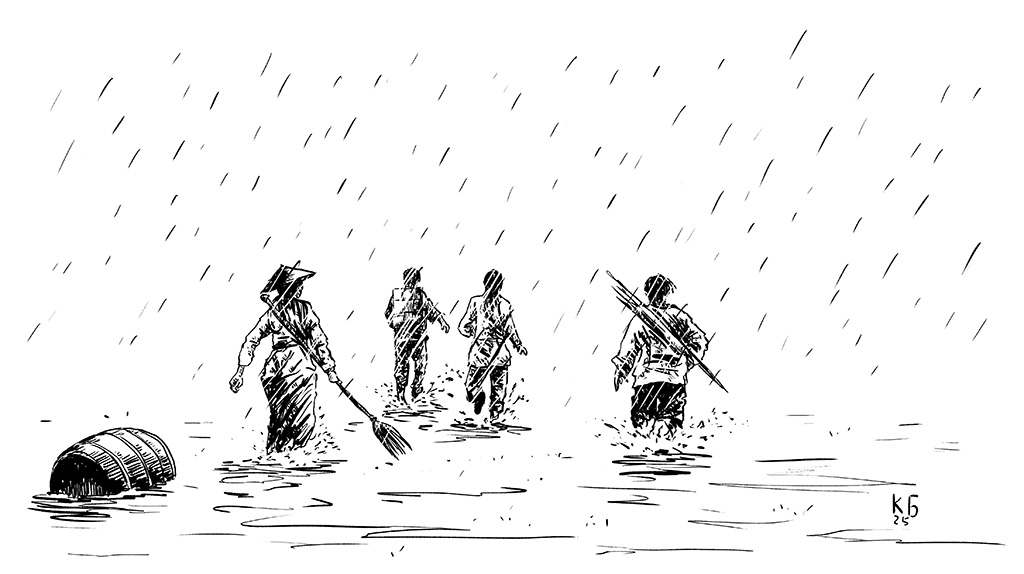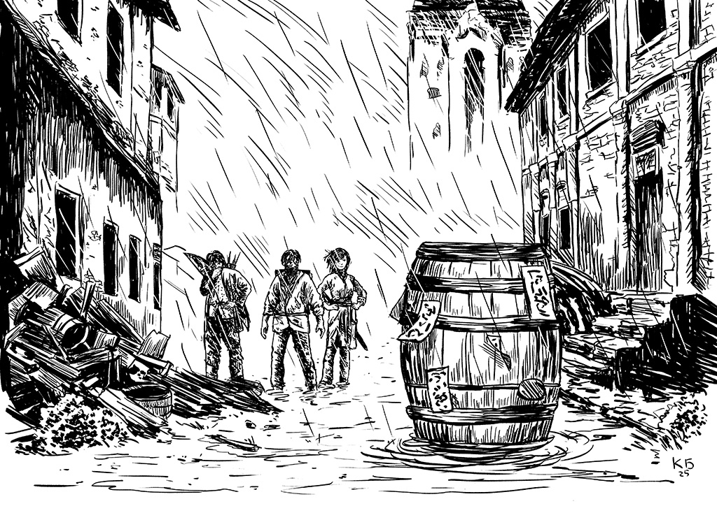 Джэйгэ вырвался вперед и побежал по улице со всех ног. Остальные спешили за ним, но Кюимеи не рассчитала силы, поскользнулась и упала на колени. Сардан помог ей подняться. Вскоре наткнулись на груду обломков – несколько перевернутых телег снесло водой и навалило вокруг комья травы, кустов и веток. Поток нес по дорогам доски, тряпки, книги и бочки – как правило разбитые и пустые. Гробы были повсюду: стояли у стен, валялись во дворах, плавали в лужах, лежали раскуроченные на лестницах и в траве. Дождь свирепел, и воды в городе потихоньку прибывало, а отводные каналы были забиты мусором.
