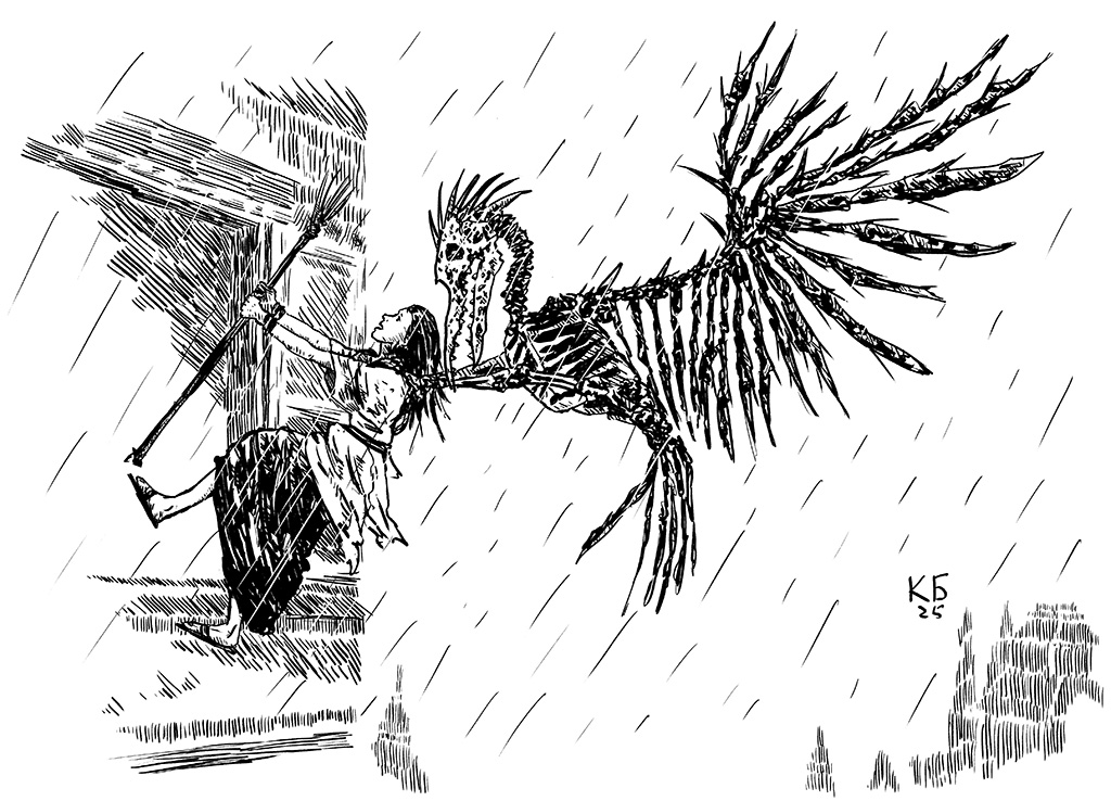 Птица выгнулась и захрипела, оглушительно громко – но неслышимо для человеческого уха. Вдруг в пелене дождя показались черные крапинки: десятки, а может и сотни чахлых птиц с горящими недобрым светом глазами вспорхнули над городом и закружились вокруг той, что их призвала.