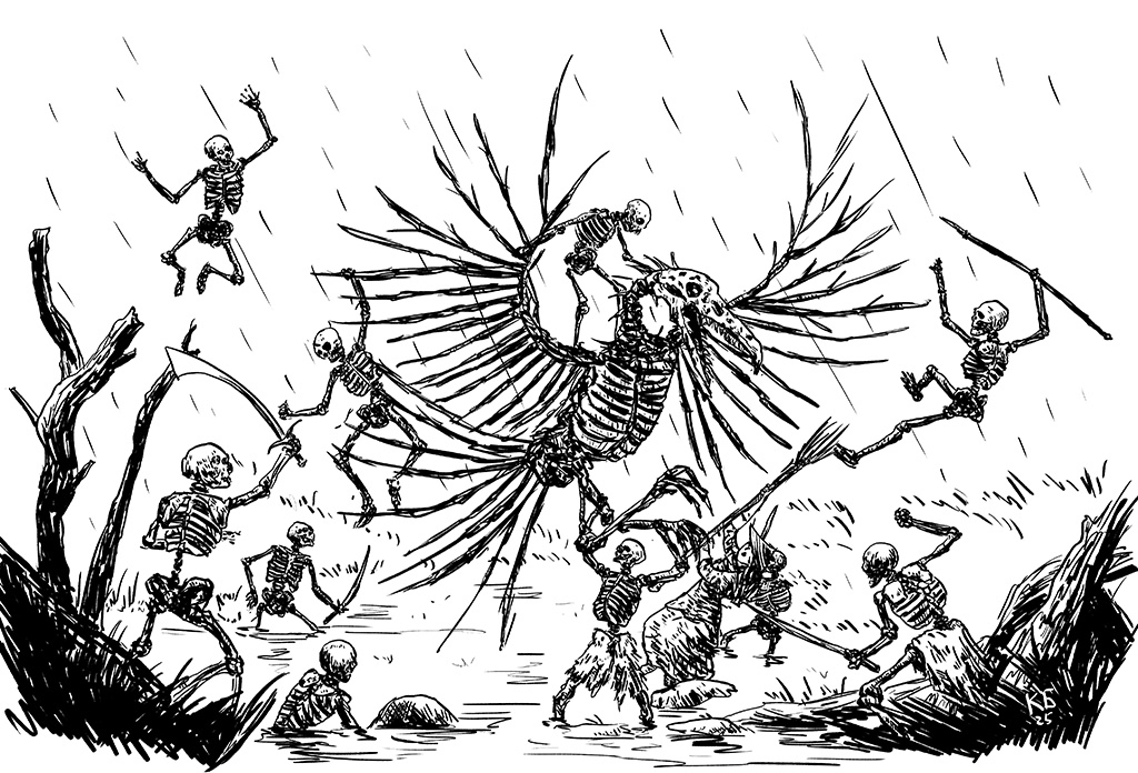 Скелеты тем временем навалились на костлявую птицу всей оравой. Птица сопротивлялась натиску отчаянно: одному сшибла клювом челюсть, другому половину ребер ударом крыла, третьего столкнула в болото, и всё это – дергая из рук Кюимеи посох.