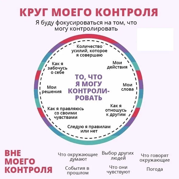 Существует два круга контроля. Первый круг – зона нашего контроля. Сюда входят любые процессы, на которые мы действительно можем повлиять. Второй круг – зона вне нашего контроля. Здесь находится все то, на что мы лично не можем оказать влияние.