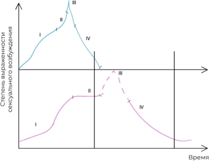 На рисунке представлен график сексуальной реакции мужчины (голубой цвет) и женщины (розовый цвет). На нем отчетливо видна разница именно на первой стадии. У женщин фаза возбуждения протекает медленнее и нарастает более плавно. У мужчин возбуждение происходит быстрее и ярче. Фаза возбуждения тесно связана с психоэмоциональным настроем женщины. Если она расположена к мужчине, у нее есть к нему симпатия, желание заняться сексом именно с ним, то и фаза возбуждения будет ярче и быстрее. На физиологическом уровне стойкое возбуждение обеспечивает выделение смазки, кровь наполняет половые органы быстрее, активизируются все рецепторы. Психологически эта стадия подразумевает расслабленность. Женщина готова к соитию.