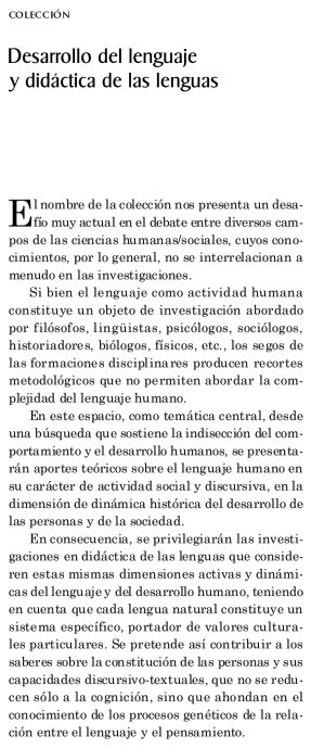En particular, a la doctora Dora Riestra agradezco que abrió y abre el camino del Interaccionismo Socio Discursivo a quienes investigamos en la enseñanza de la lengua materna en nuestro país. Me siento agradecida por sus lecturas atentas de las diferentes versiones de mis escritos y por la posibilidad de publicar la tesis en esta colección.
