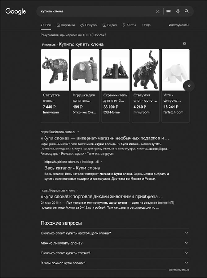 После колдунщика идет верхняя рекламная выдача. О ней, как и о нижней части выдачи, подробно поговорим позже, разбирая контекстную рекламу в 5-ой части книги.