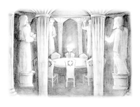 За второй дверью, с изображением птицы гамаюн, они очутились в большой круглой зале, с колоннами и четырьмя статуями волшебников в полный рост. Их лица были красивы и мужественны. Дрёмы, никогда прежде не видевшие волшебников, вглядывались в величественные каменные изваяния, открыв рты от изумления. По центру комнаты стоял круглый стол и восемь изящных стульев с высокими резными спинками. Посредине на столе находилась большая чаша на высокой ножке. Вокруг неё стояло ещё восемь малых чаш, по числу стульев. На стене, между статуями, висел красивый гобелен от потолка до пола. На нём была изображена группа из восьми берендеев, сидевших за тем самым круглым столом и держащих в руках чаши. От всех чаш шли верх лучи и соединялись в центре в одно большое солнце.