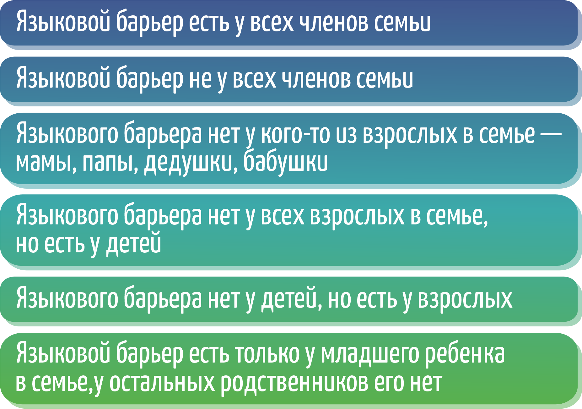 При семейной иммиграции языковой барьер у кого-то из членов семьи может стать непреодолимым, а у кого-то – отсутствовать вообще. Чаще всего речь идет о следующих ситуациях: