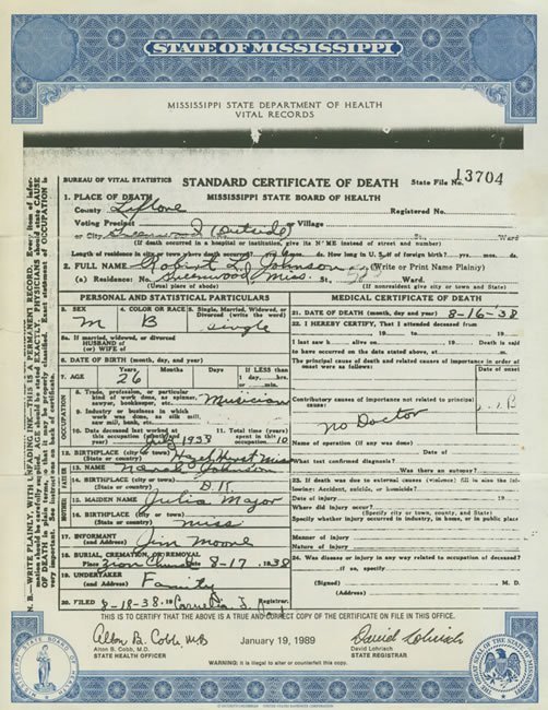 Il certificato di morte di Johnson più famoso, secondo il quale l'artista era morto per stricnina.