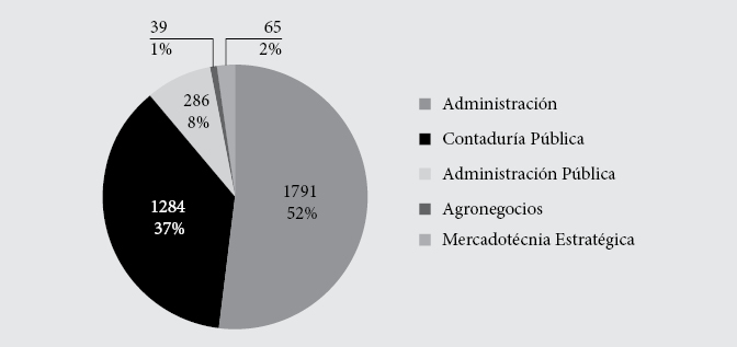 Actualmente, la FCA ofrece cinco carreras a nivel licenciatura: Administración, Contaduría Pública, Administración Pública, Agronegocios y, recientemente, Mercadotecnia Estratégica. Como se observa en la figura 1, la mayor proporción de alumnos se encuentran en las licenciaturas en Contaduría Pública y Administración, con un 52% y 37%, respectivamente.