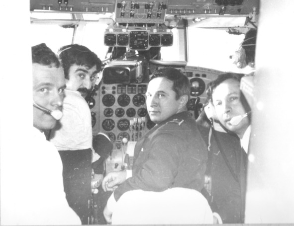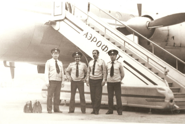 Инструкторский экипаж Ил-18 академии. Штурман Александр Саватеев, командир Владимир Баршт, бортмеханик Валерий Поляков, бортрадист Эдуард Дмитриев, справа Александр Артёменко.