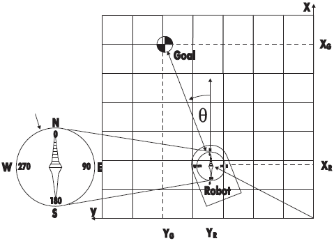 Рис. 1.2. Это исходное положение робота, использующего информацию, обеспеченную системой позиционирования. За основу для вычисления курса берётся безотносительное (абсолютное) местоположение робота и цели. Электронный компас (увеличенный вид компаса – слева) позволит роботу следовать найденным курсом