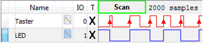 Es ist zu sehen, dass sich immer bei der ansteigenden Flanke des Tasterimpulses der Zustand der LED ändert.