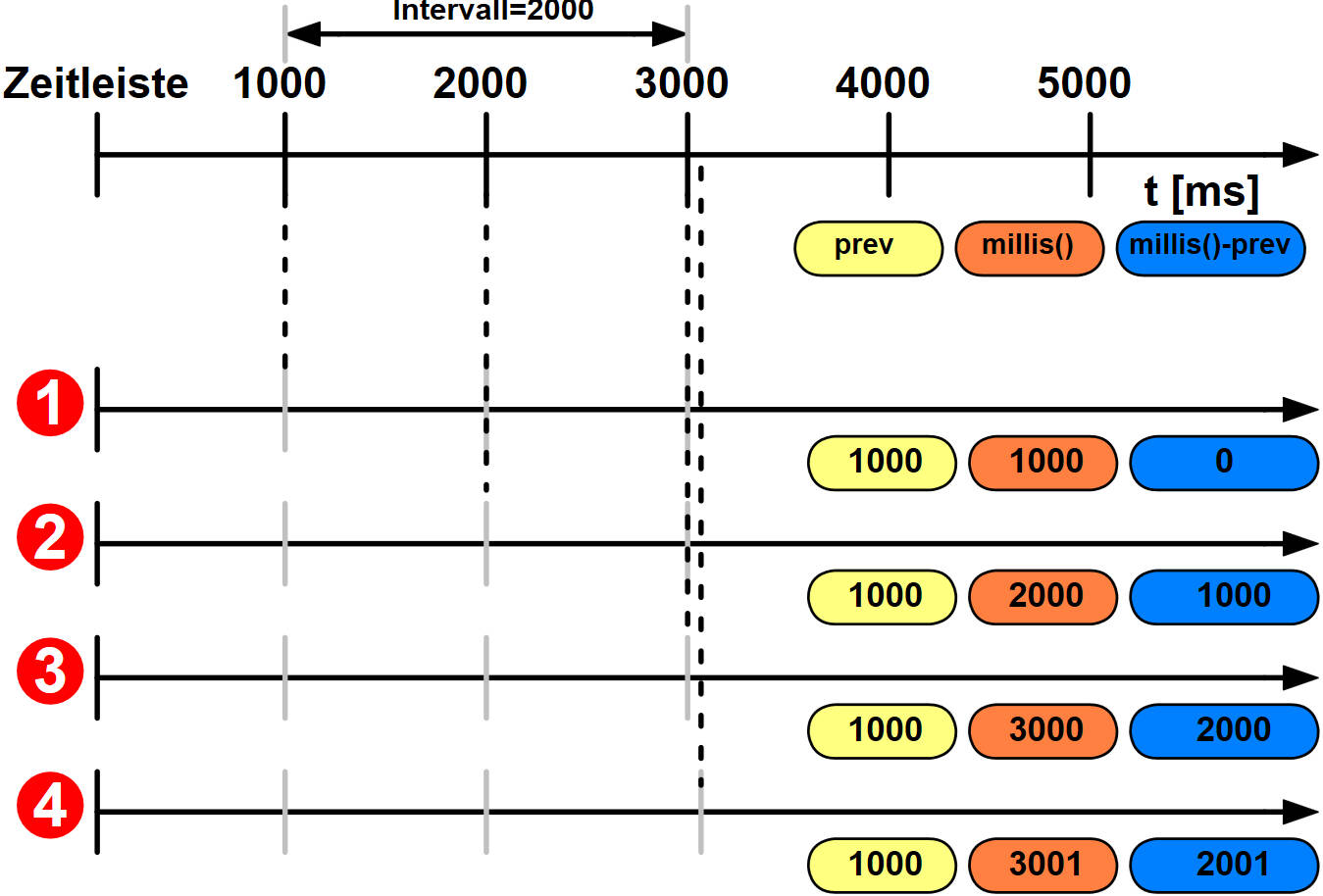 Jedes Mal, wenn der Taster (Taster-Pin) gedrückt wird, folgt der Pegel der Taster-LED. Und das Ganze unabhängig vom Zustand beziehungsweise Pegelwechsel an Pin 13 (Blink-LED). Für die Intervallsteuerung benötigen wir eine neue Funktion, die sich millis nennt und wie folgt aussieht: