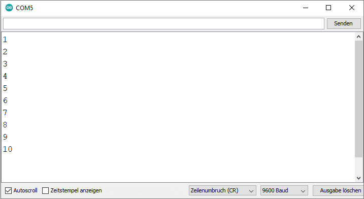 Theoretisch sollte pro einzelnem Tastendruck der angezeigte Wert um 1 erhöht werden. Das scheint auch teilweise zu stimmen, doch nicht immer. Manchmal wird der Wert je Tastendruck um mehr als 1 erhöht, was auf das angesprochene Prellen hinweist. Öffne den Serial Monitor und beobachte die Anzeige. Man sollte meinen, dass bei jedem Tastendruck der Zähler um den Wert 1 erhöht wird, was jedoch nicht immer der Fall ist.
