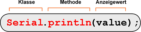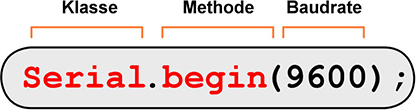 Die Variable tasterPin wird mit dem Wert 8 initialisiert, da dort der Mikrotaster angeschlossen ist. Um später die Anzahl der Impulse zu speichern, wird eine Variable mit Namen impulse deklariert und mit dem Wert 0 initialisiert. Die Initialisierung der seriellen Schnittstelle erfolgt über ein entsprechendes Objekt innerhalb der setup-Funktion. Zuerst wird die Klasse genannt und im Anschluss – durch einen Punkt voneinander getrennt – die Methode mit dem Parameter. Die genauere Erläuterung erfolgt im Bastelprojekt über die objektorientierte Programmierung, wo es um Objekte, Klassen und Methoden geht.
