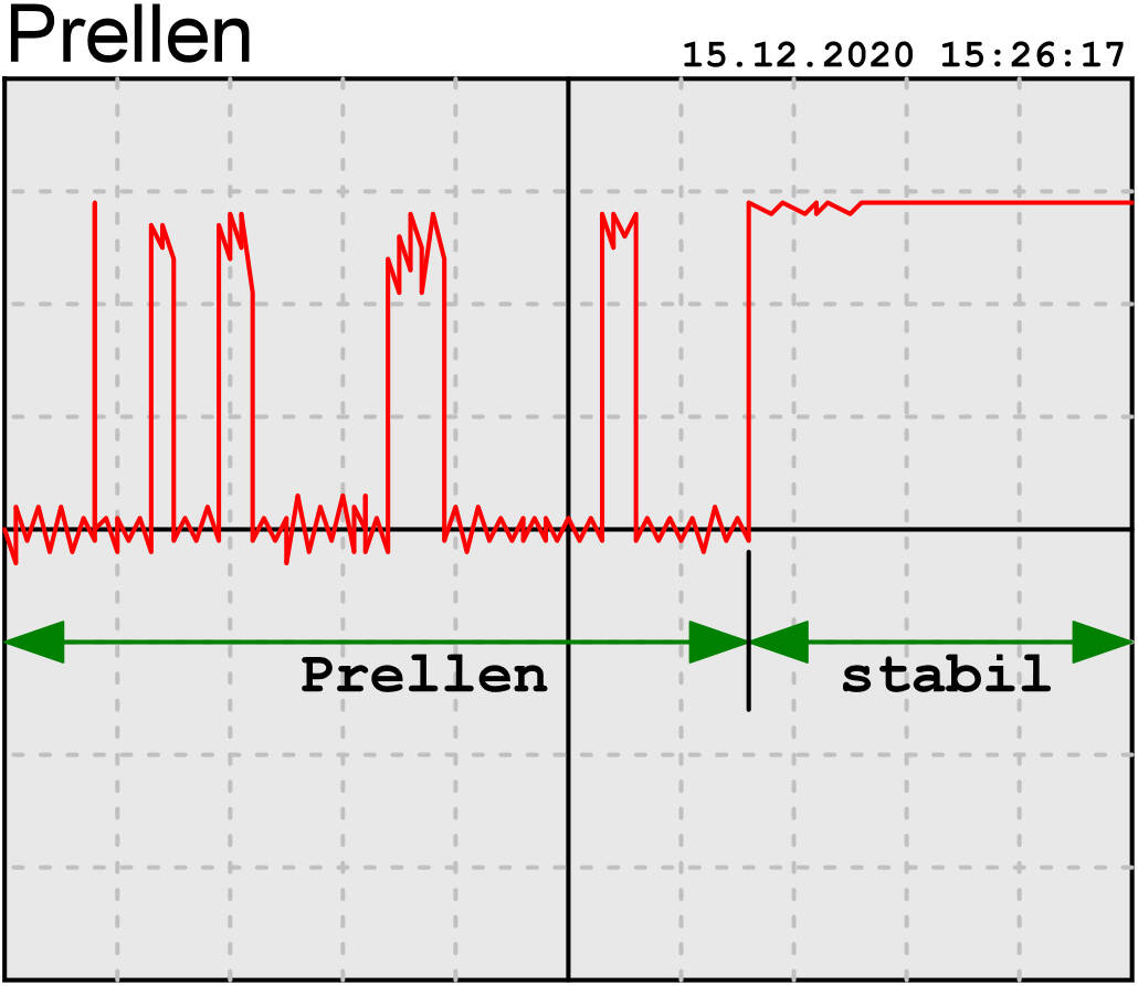 In der Elektromechanik gibt es einen Störeffekt, den man Prellen nennt. Wenn du einen ganz normalen Taster drückst und gedrückt hältst, sollte man meinen, dass der mechanische Kontakt im Taster dauerhaft geschlossen wird. Das ist jedoch meistens nicht der Fall, denn wir haben es mit einem Bauteil zu tun, das innerhalb einer sehr kurzen Zeitspanne – im Millisekundenbereich – den Kontakt mehrfach öffnet und wieder schließt. Die Kontaktflächen eines Tasters sind in der Regel nicht vollkommen glatt, und wenn wir sie uns unter einem Elektronenmikroskop ansähen, sähen wir viele Unebenheiten und Verunreinigungen. Das führt dazu, dass die Berührungspunkte der leitenden Materialien bei Annäherung nicht sofort und nicht auf Dauer zueinanderfinden. Eine weitere Ursache für den hier angeführten Effekt, den man Prellen nennt, kann im Schwingen oder Federn des Kontaktmaterials liegen, wodurch bei Berührung kurzzeitig der Kontakt mehrfach hintereinander geschlossen und wieder geöffnet wird.