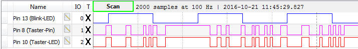 In diesem Sketch haben wir es mit einigen Variablen zu tun. Ich beginne mit der sogenannten Intervallsteuerung. Das folgende Impulsdiagramm zeigt uns das Verhalten der Schaltung und es ist genau so, wie es erwünscht ist: