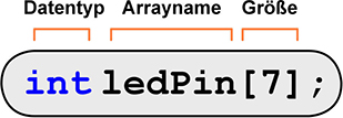 int ledPin[7]; // Deklaration des Arrays mit 7 Elementen void setup() { ledPin[0] = 7; ledPin[1] = 8; ledPin[2] = 9; ledPin[3] = 10; ledPin[4] = 11; ledPin[5] = 12; ledPin[6] = 13; // ... }