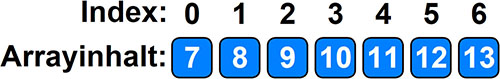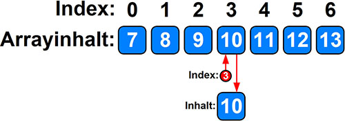 Das erste Array-Element hat immer den Index mit der Nummer 0. Deklarierst du etwa ein Array mit zehn Elementen, dann ist der höchste zulässige Index der mit der Nummer 9, also immer eins weniger als die Anzahl der Elemente. Hältst du dich nicht daran, dann provozierst du möglicherweise einen Laufzeitfehler, denn der Compiler, der hinter der Entwicklungsumgebung steckt, bemerkt das weder zur Entwicklungszeit noch später zur Laufzeit, und deshalb solltest du doppelte Sorgfalt walten lassen.