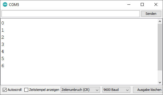 Du siehst hier, wie die Werte der Laufvariablen i von 0 bis 6 ausgegeben werden, die wir in unserem eigentlichen Sketch zur Auswahl der Array-Elemente benötigen. Ich habe den Code innerhalb der setup-Funktion platziert, damit die for-Schleife nur einmal ausgeführt wird und die Anzeige nicht ständig durchläuft.