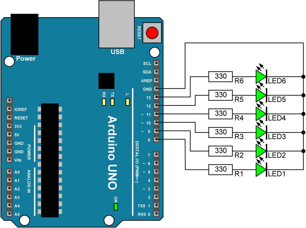Im Bastelprojekt 2 über die Low-Level-Programmierung des Arduino haben wir gesehen, wie einfach es ist, die digitalen Pins über die Manipulation von Registern zu beeinflussen. Hinsichtlich des Lauflichts kann man sich die Sache zunutze machen. Der nachfolgende Schaltplan verfügt lediglich über sechs LEDs mit den entsprechenden Vorwiderständen, wobei ich aber jeder LED eine kleine Zahl beigestellt habe. Wozu das ganze sinnvoll ist, werden wir gleich sehen.