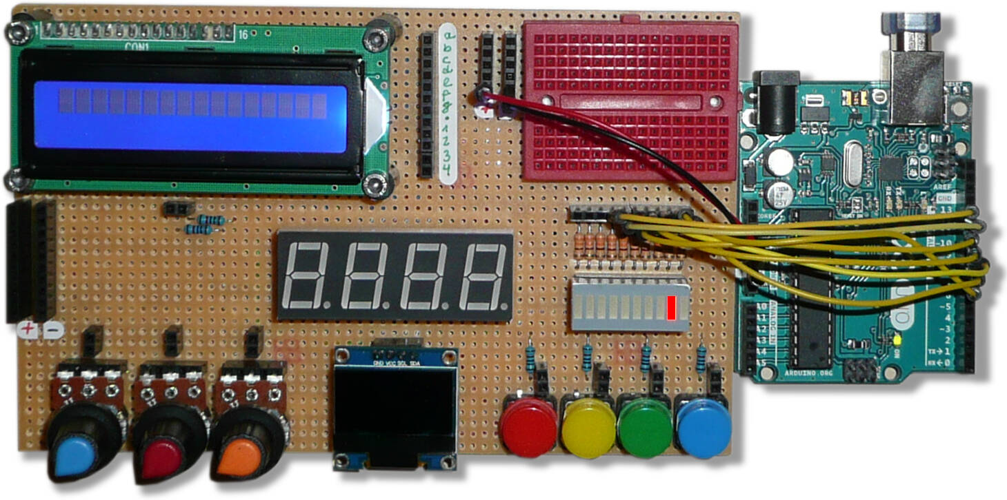 Auch der Schaltungsaufbau ähnelt dem aus dem vorherigen Bastelprojekt und das Arduino Discoveryboard mit seinen zehn LEDs im Block leistet auch hier wieder sehr gute Dienste. Es werden hierbei nur sieben der LEDs angesteuert.