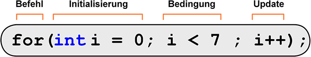 Die Angabe des Datentyps innerhalb der Schleife besagt, dass es sich um eine lokale Variable handelt, die nur so lange existiert, wie die for-Schleife iteriert, also ihren Durchlauf hat. Beim Verlassen der Schleife wird die Variable i aus dem Speicher entfernt. Die genaue Bezeichnung für eine Variable innerhalb einer Schleife lautet Laufvariable. Sie durchläuft so lange einen Bereich, wie die Bedingung (i < 7) erfüllt ist, die hier mit Test bezeichnet wurde. Anschließend erfolgt ein Update der Variablen durch den Update-Ausdruck. Der Ausdruck i++ erhöht die Variable i um den Wert 1.
