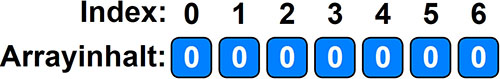 Bei dem hier gezeigten Array wurden nach der Deklaration alle Elemente implizit mit dem Wert 0 initialisiert. Die Initialisierung kann jedoch explizit auf zwei unterschiedliche Weisen erfolgen. Wir haben den komfortablen Weg gewählt und die Werte, mit denen das Array versehen werden soll, in geschweiften Klammern hinter der Deklaration, durch Komma separiert, aufgelistet.