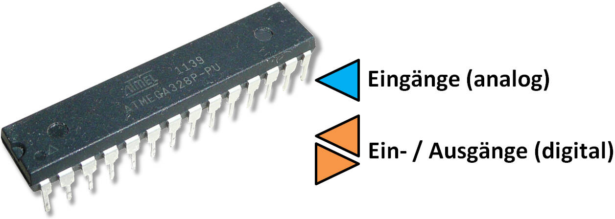 Du siehst hier den Mikrocontroller, der über bestimmte Schnittstellen mit uns kommunizieren kann. Manche Ports sind als Eingänge, andere als Ein- und Ausgänge vorhanden.