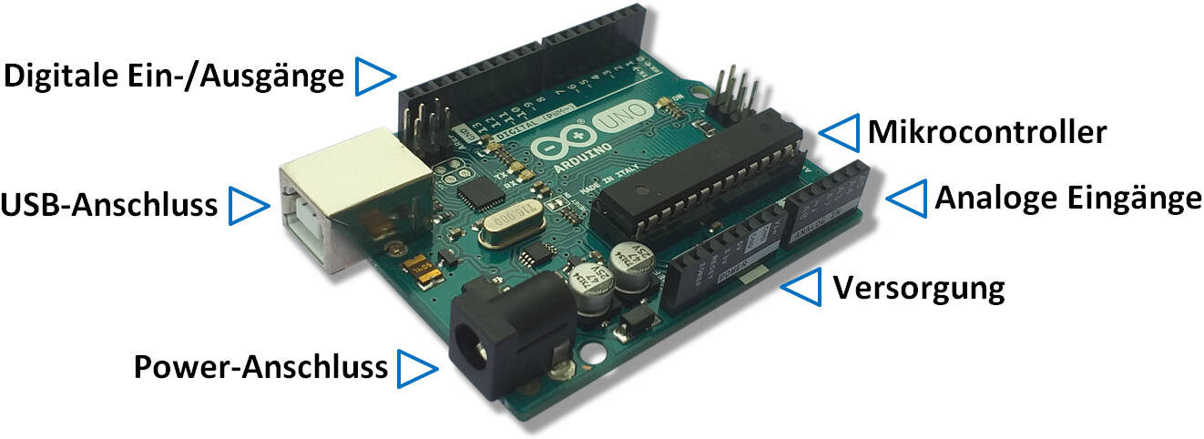 Zu Beginn nehmen wir das Arduino-Board unter die Lupe. Auf der folgenden Abbildung habe ich einige der wichtigsten Komponenten auf der Platine markiert und beschriftet: