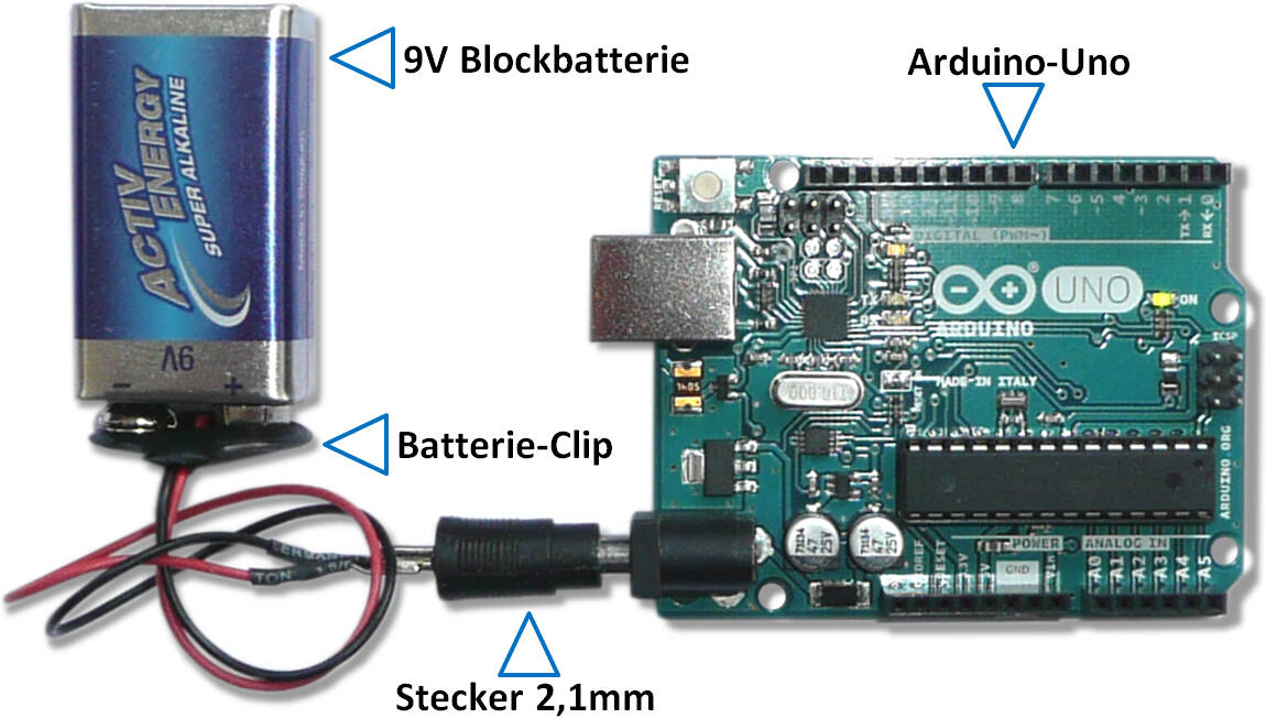 Abb. 3: Der Arduino Uno mit externer Spannungsversorgung über eine Batterie