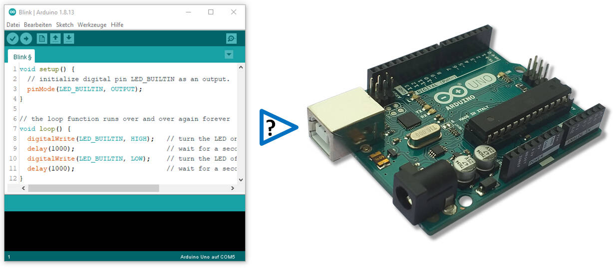 Wenn das Arduino-Board von der IDE erkannt wurde, wollen wir im nächsten Schritt die Kommunikation zwischen Rechner und Arduino testen. Wenn ich von Kommunikation rede, dann meine ich im Moment die Übertragung eines Sketches (wir erinnern uns: Im Arduino-Umfeld wird ein Programm Sketch genannt) – zum Mikrocontroller-Board. Am besten laden wir uns den Blink-Sketch in die IDE und passen die Blinkrate etwas an. Dann kompilieren und übertragen wir den Sketch zum Arduino und sehen, was passiert. Hier die einzelnen Schritte, wobei ich voraussetze, dass die Installation erfolgreich war und der Arduino von der IDE nach deren Start erkannt wurde.