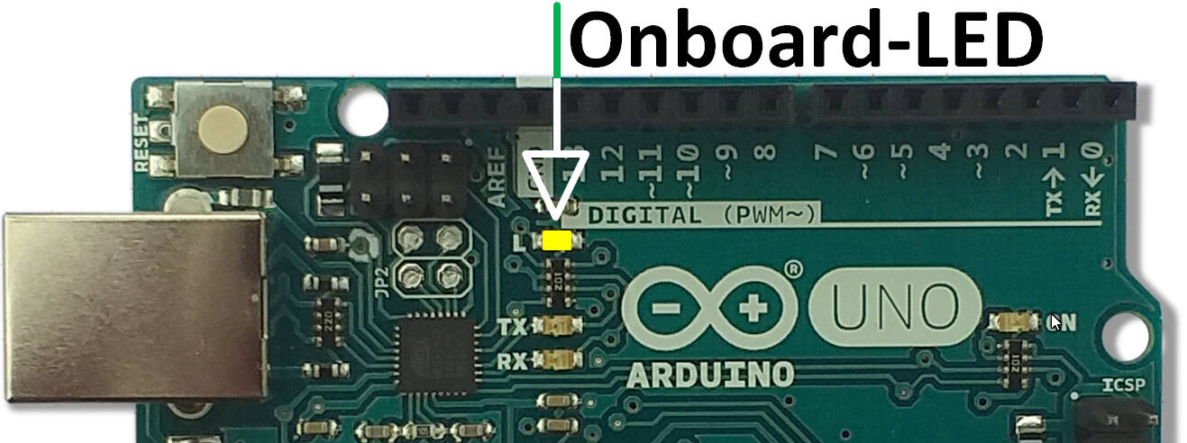 Wird ein fabrikneues Arduino-Board mit Spannung versorgt, blinkt die auf dem Board befindliche LED (gekennzeichnet mit L) im Sekundentakt.