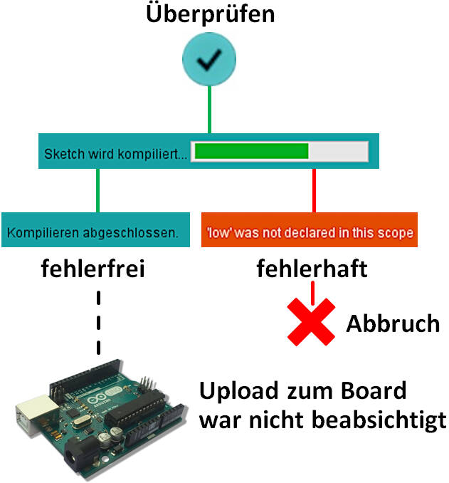 Zu Beginn startet die Kompilierung mit der Anzeige des Fortschritts über den grünen Balken. Ist kein syntaktischer Fehler gefunden worden, wird dieser Vorgang mit der Meldung beendet, dass die Kompilierung abgeschlossen ist. Ein Upload des Maschinencodes zum Mikrocontroller des Arduino Uno erfolgt dabei nicht. Wurde jedoch ein Fehler im Sketch-Code gefunden, so bricht der Vorgang des Kompilierens mit einer entsprechenden Fehlermeldung ab.