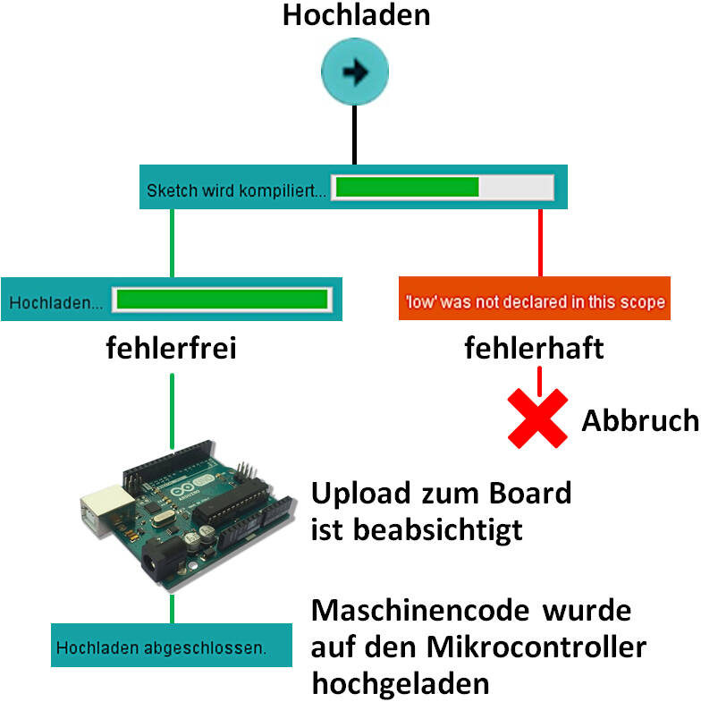 Das zweite Symbol analysiert ebenfalls den Quellcode und es werden die gleichen Prozeduren wie beim Überprüfen durchgeführt. Jedoch erfolgt hier nach einer fehlerfreien Kompilierung das Hochladen des Maschinencodes zum Mikrocontroller des Arduino Uno. Auf der nachfolgenden Abbildung 6 ist der Ablauf zu sehen: