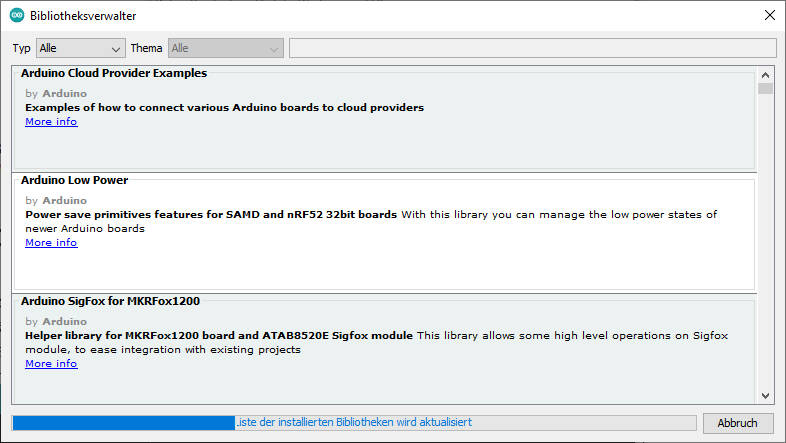 Nach einem Mausklick auf den angezeigten Link Bibliotheken öffnet sich ein neues Fenster, in dem die neuen Updates zur Auswahl angezeigt werden und die Liste der installierten Bibliotheken wird aktualisiert, was am unten angezeigten Fortschrittsbalken zu sehen ist: