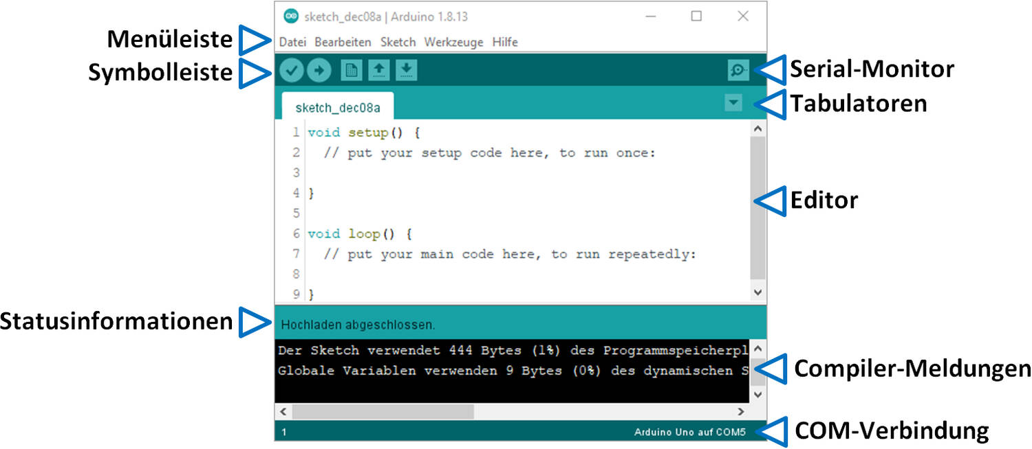 Abb. 2: Die Bereiche der Arduino-Entwicklungsumgebung