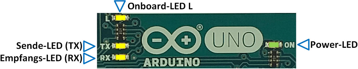 Es kann auch ohne Umweg über das vorherige Kompilieren sofort das Hochladen gewählt werden, weil eine vorherige Kompilierung dort ebenfalls ausgeführt wird. Während des Uploads – so wird das Hochladen im Englischen genannt – leuchten einige LEDs, die sich auf dem Arduino-Board befinden. Schauen wir genauer hin: