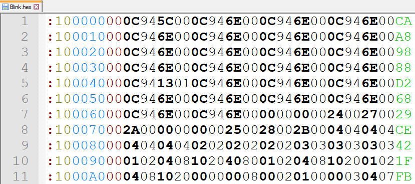 Im Anschluss wird der Code mit einigen Arduino-Bibliotheken, die grundlegende Funktionalitäten bereitstellen, zusammengeführt und als Ergebnis eine Intel-HEX Datei erstellt. Es handelt sich dabei um eine Textdatei, die binäre Informationen für Mikrocontroller speichert. Hier zeige ich einen kurzen Ausschnitt aus dem ersten Sketch: