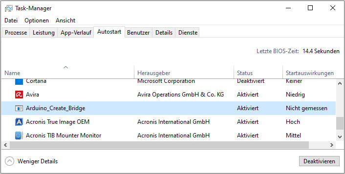 Hinsichtlich des zu installierenden Plug-ins bei der Verwendung des webbasierten Arduino Create handelt es sich nicht um ein Browser-Plug-in, sondern um einen Agenten, der im Hintergrund arbeitet und quasi browserunabhängig seinen Dienst verrichtet. Jeder andere Browser nutzt diesen Agenten und sollte dann darüber eine Verbindung zur Cloud beziehungsweise zum Arduino herstellen können. Dieser Agent wird übrigens nach jedem Neustart des Systems gestartet. Du kannst die Informationen über den Task-Manager einholen, in dem du in den Tab-Reiter Autostart wechselst. Dort ist ein Eintrag mit dem Namen Arduino_Create_Bridge zu sehen: