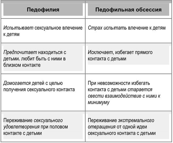 В таблице ниже приведены отличительные характеристики педофильного расстройства (а также педофильного сексуального влечения) и навязчивых мыслей педофильного содержания. Таким образом, разница между реальным педофилом и человеком, страдающим от обсессий педофильного содержания, выражается в следующем: