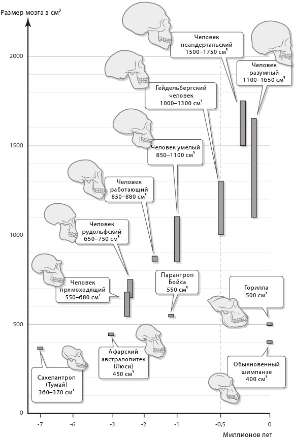 Первые позвоночные поедали другие организмы: растительные или животные. Эти морские хищники обладали примитивным мозгом и вначале идентифицировали свою добычу главным образом с помощью обоняния. Затем они распространились на суше. Примерно 80 миллионов лет назад на Земле появились гораздо более опасные хищники – приматы, к числу которых относимся и мы. Приматы обнаруживали добычу издалека благодаря зрению. Расположенные у приматов спереди глаза связаны с более объемным и более сложно устроенным мозгом по сравнению с мозгом их биологических предков. Этот крупный мозг требует значительных затрат: помимо существенного расхода энергии, он нуждается в интенсивном развитии, продолжительность которого выходит за пределы периода внутриутробной жизни. Вот почему возникает потребность в родителях, которые должны присматривать за новорожденным и кормить его в течение длительного периода, так как он полностью зависит от них сразу же после рождения. Необходимость постнатального (после рождения) развития мозга обусловлена тем, что вмещающая полностью сформированный мозг черепная коробка была бы слишком объемной, чтобы пройти через узкий канал, предназначенный природой для рождения. Мозг также использует куда более богатый опыт, чем ограниченный опыт находившегося в матке эмбриона. Поэтому те преимущества, которые крупный мозг дает приматам, намного превосходят связанные с ним высокие затраты: несмотря на ряд корректировок, касающихся соотношения затрат и пользы, в ходе эволюции у гоминидов прослеживается тенденция к увеличению его объема (рисунок 1).