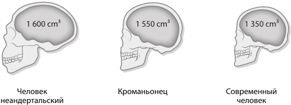 Дело в том, что после продолжавшегося в течение 2 миллионов лет роста мозг уменьшился и от объема 1 550 см³, который был у наших предков кроманьонцев, за последние 20 000 лет он сократился до нынешних 1 350 см³. Следует отметить, что самый крупный мозг, который был у живших по всей Евразии в период с 120 000 по 35 000 гг. до н. э. наших предков – неандертальцев (он доходил до 1 680 см³), не спас их от вымирания (рисунок 2). Для самых крупных мозгов Homo sapiens находится место в ограниченном пространстве черепной коробки благодаря одной уловке эволюции: вместо того, чтобы постепенно вытягиваться, как это происходит у других животных, они сохраняют до взрослого возраста округлую форму черепа новорожденного (в эволюционной биологии такое постоянство называется «педоморфизм»).